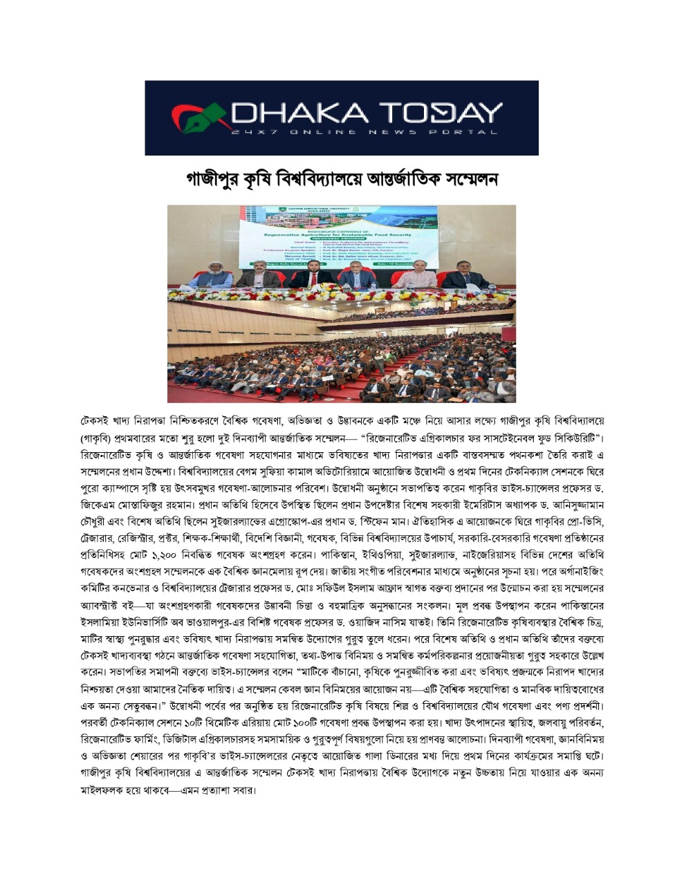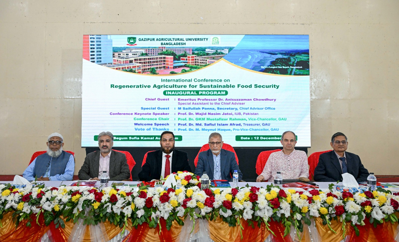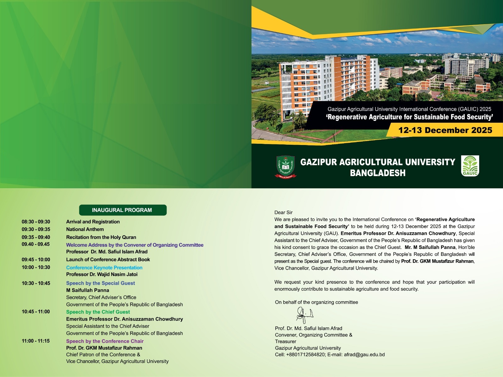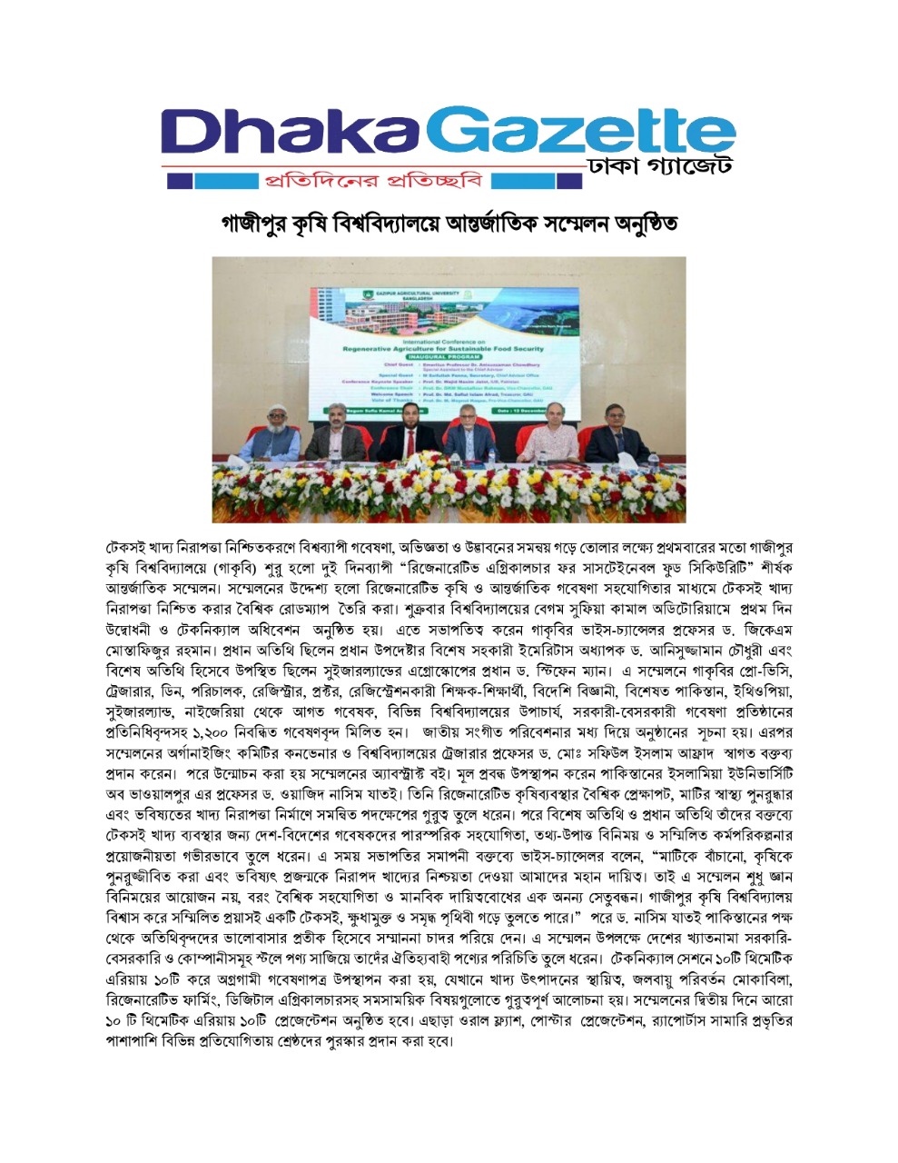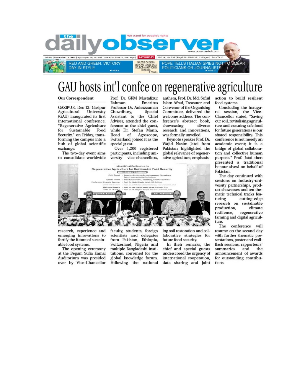 Day 01: An International Conference on “Regenerative Agriculture for Sustainable Food Security (ICRASFS)” by Gazipur Agricultural University, Bangladesh (GAUB) was takes place on 12-13 December 2025. This conference covers different areas of research relevant to UN-SDG’s directly/indirectly linked with Climate Action, Food Security, Sustainability, Conservation. Prof. Dr. Anisuzzaman Chowdhury, Special Assistant to the Chief Advisor, Government of the People’s Republic of Bangladesh; Prof Dr G.K.M Mustafizur Rahman, Vice Chancellor; Prof. Dr. Md. Safiul Islam Afrad Chair of Organizing Committee & Treasure; Prof Dr Nasimul Bari, Dean-Faculty of Agriculture “Gazipur Agriculture University, Bangladesh; Dr Stefan Mann, Agroscope, Switzerland; appreciate and acknowledge the contribution of Conference Keynote Speaker Prof. Dr Wajid Nasim Jatoi, The Islamia University of Bahawalpur (IUB), Pakistan. During Visit, Inaugural Session completed with lot of successful collaborations, presented gift of Saraiki AJARAK to Honorable Guests, capacity building of students’ that includes sessions of under/post graduate students/discussions, Gala Dinner with Urdu Gazal on special compliments from Honorable Vice Chancellor, GAU, Bangladesh.